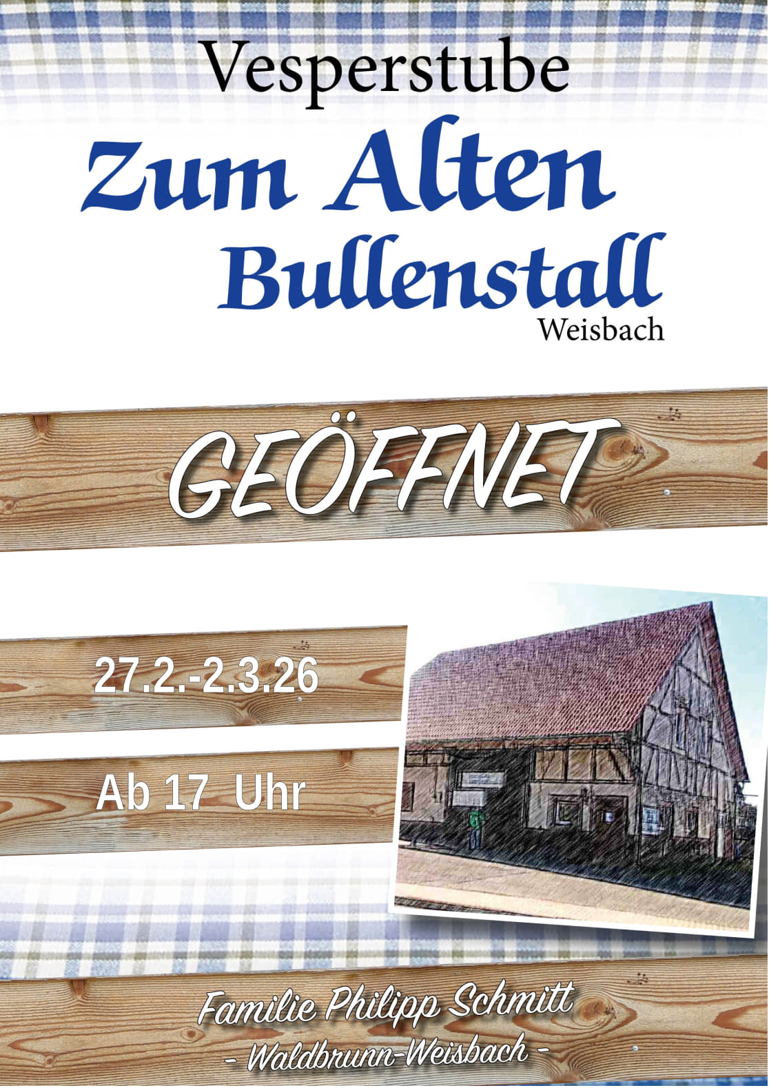 « Alle Veranstaltungen Vesperstube „Zum Alten Bullenstall“ hat geöffnet 27. Februar - 2. März « Königschiessen beim KKS Weisbach Generalversammlung beim KKS Weisbach » Zum Kalender hinzufügen Google Kalender iCalendar Outlook 365 Outlook Live Details Beginn: 27. Februar Ende: 2. März Veranstalter Philipp Schmitt Veranstaltungsort Ehemaliger Bullenstall Weisbach Mosbacher Strasse 16 Waldbrunn, 69429 Deutschland Google Karte anzeigen